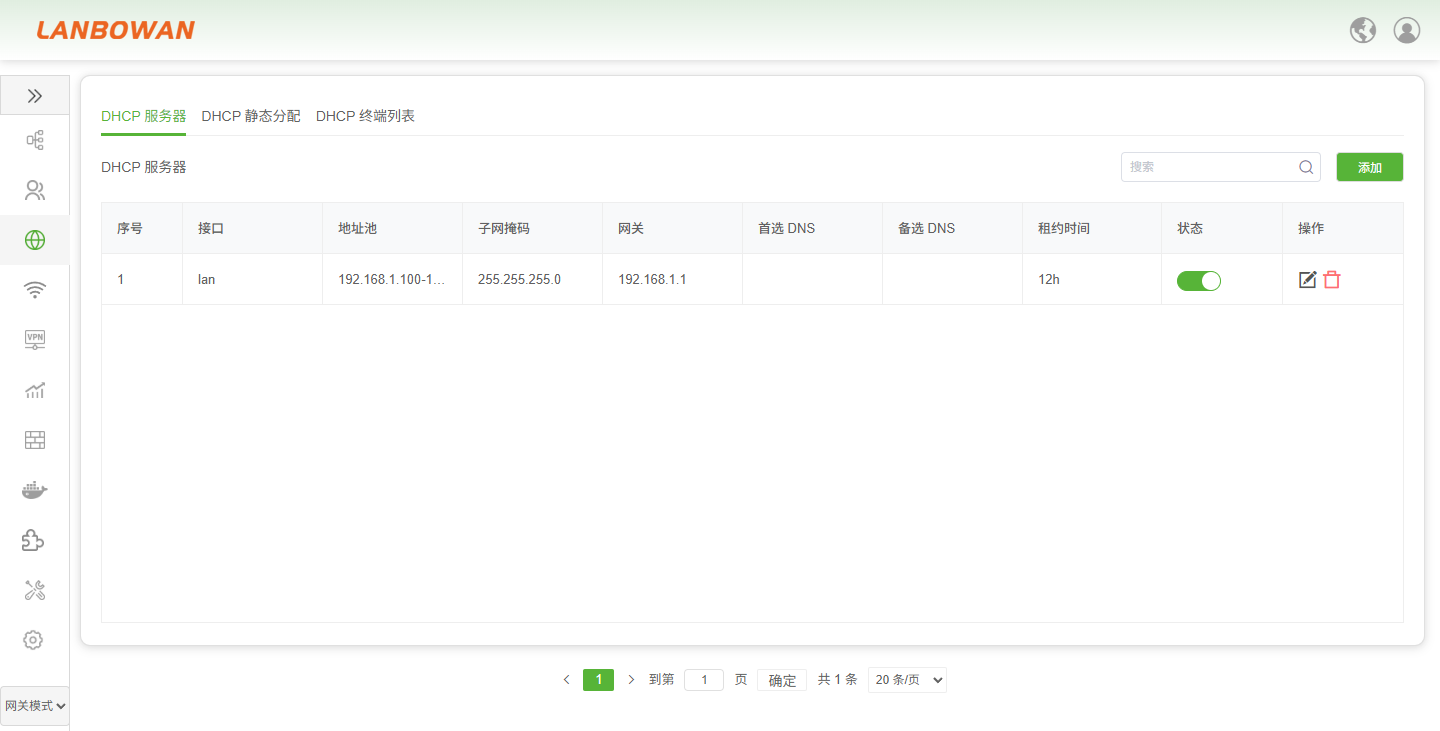 | 操作 | 点击“ ”,编辑DHCP服务器配置;点击“ ”,删除当前DHCP服务器。 |