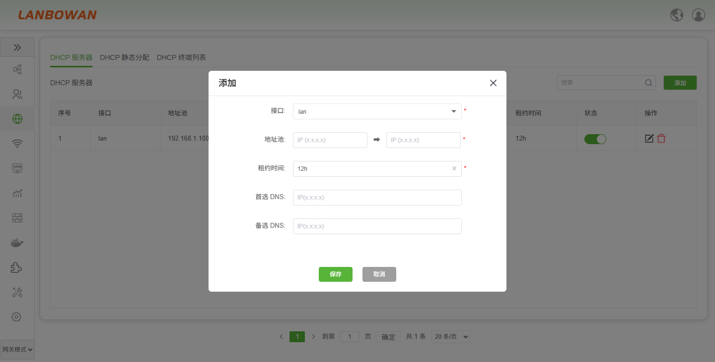 当存在多LAN或多局域网接口时,便通过添加DHCP服务器,为每个局域网接口划分DHCP服务器。