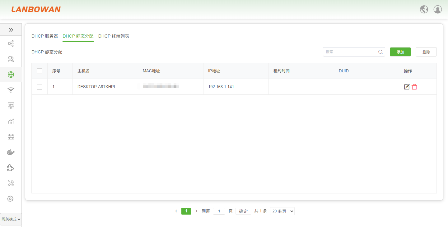 为DHCP客户端分配固定IP,可手动添加以及在DHCP终端列表中指定客户端。