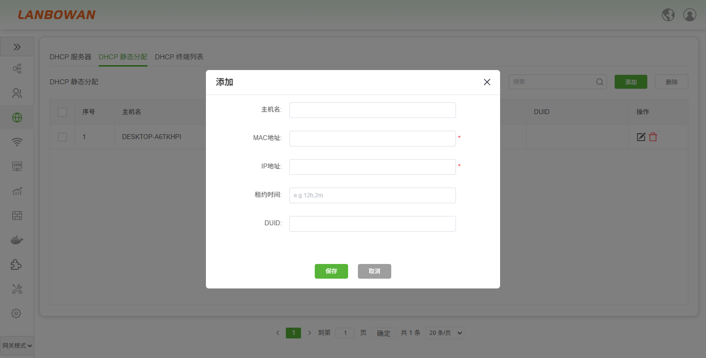 为设备终端指定IP地址,需添加对应设备MAC,以及租约时长。