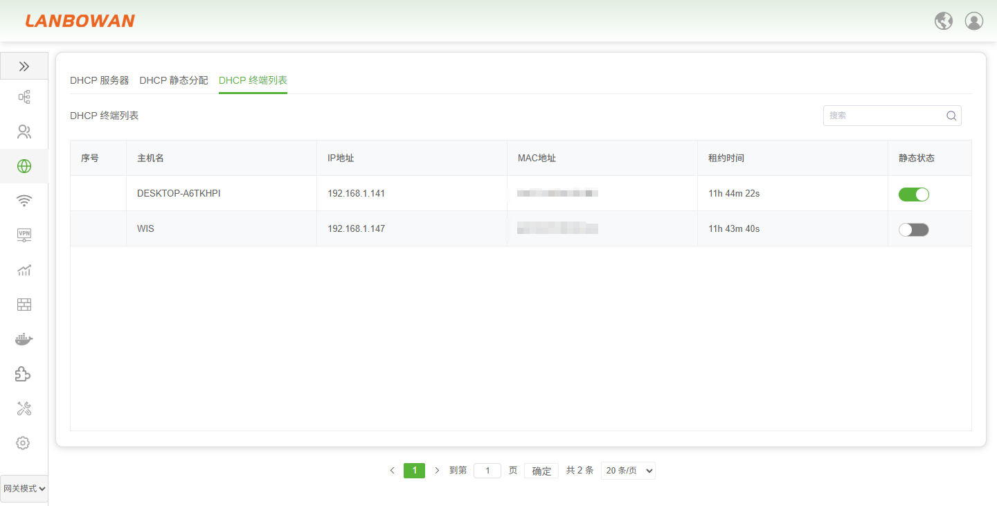 当客户端连接当前路由器并获取到DHCP服务器下发的IP地址后,会统一记录到DHCP终端列表,统一管理。可将指定终端设置为静态IP。