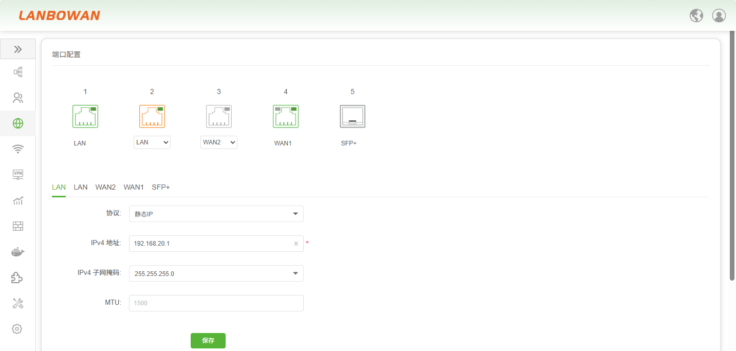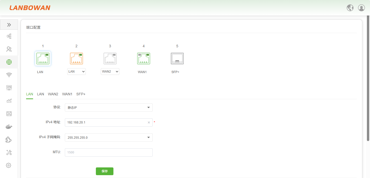 在端口配置界面,查看设备的LAN口和WAN口。点击相应的LAN口或WAN口,可对该端口进行配置。支持多LAN、多WAN,可通过端口“选择WAN/LAN”切换,切换WAN2,WAN3(WAN1与SFP+本身为WAN)。支持多LAN,可切换LAN/LAN2/LAN3,每个LAN口独立配置网段。