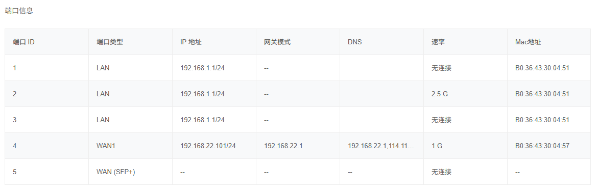 当前模块展示各端口的详细信息,如:端口类型、IP地址、网关、DNS、网口速率、MAC地址、POE状态。
