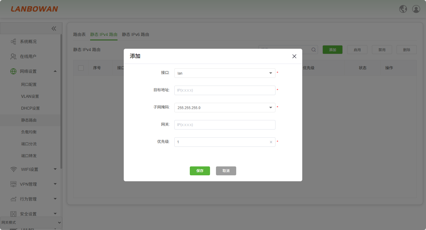 添加静态IPv4路由条目,需要填写出接口、设备要访问的目的地址、目的网络的掩码长度、设备访问接口的网关地址以及该静态路由的优先级。